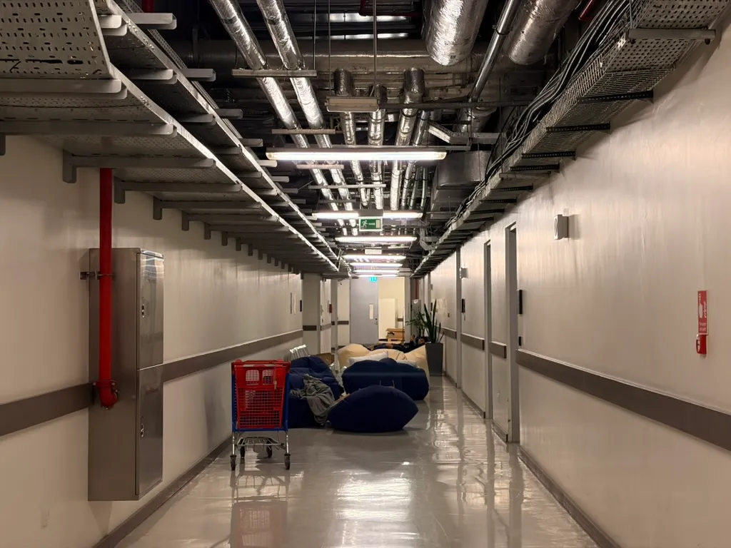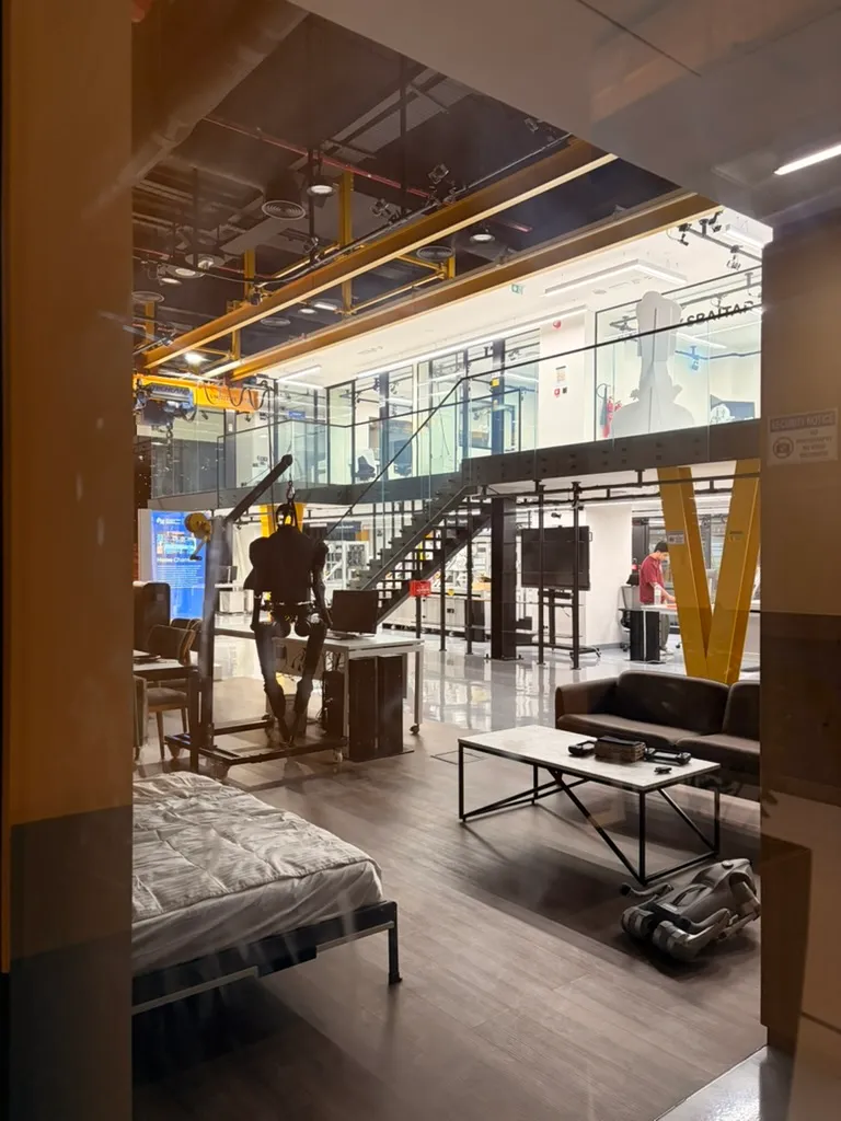 凌晨十二点半打完收工,安全起见,我们的第一目的地是1a楼下的巨大仓库,据说有很多同学都打算在那里过夜。懒人沙发上躺着形形色色的人,凌乱的杂物显得格外辛酸。机器人实验室里还有同学正在激情实验ing,机器人在灯光下运转,仿佛外界的一切与它们无关